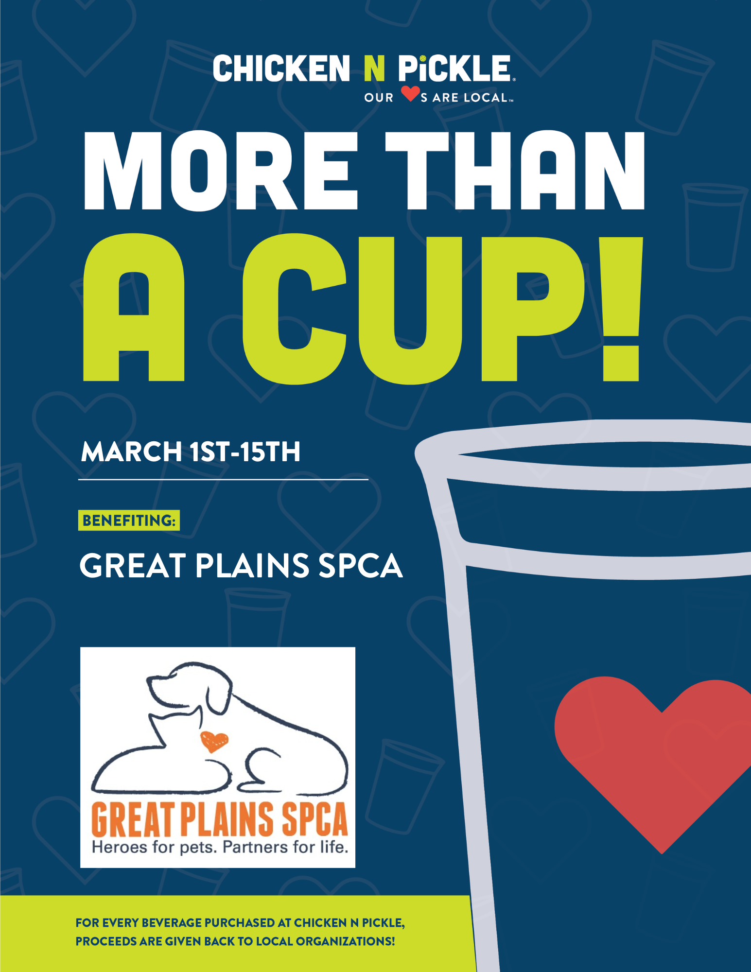 For every beverage purchased at Chicken N Pickle, proceeds are given back to Great Plains SPCA!