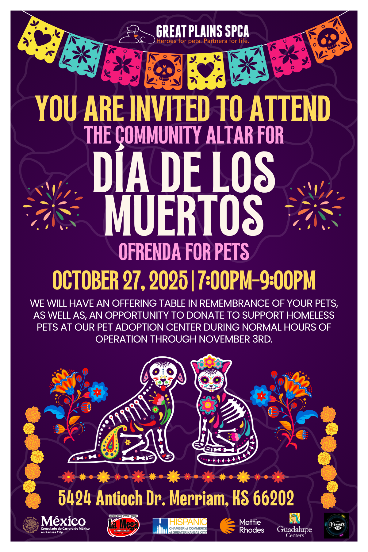 In partnership with La Mega KC, Consulado de Mexico in Kansas City, MO, Dos Tequilas KC, Hispanic Chamber of Commerce of Greater Kansas City, Mattie Rhodes Center, and Guadalupe Center. The celebration will feature a beautifully curated altar where the public is welcome to add photos, toys, treats, and mementos honoring their beloved pets. The altar will remain open for visits throughout the week during Great Plains SPCA business hours.