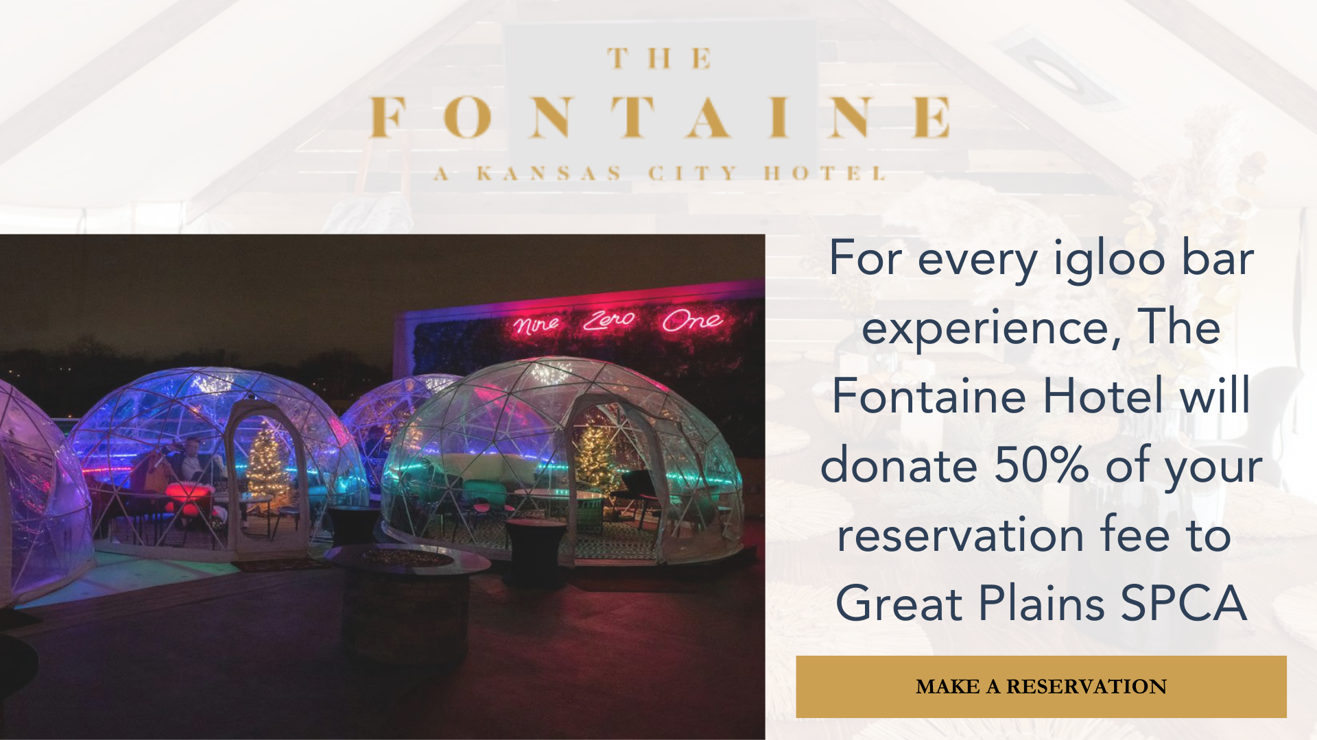Immerse yourself in a winter wonderland above Country Club Plaza in the holiday warmth of our rooftop igloos. KC’s favorite holiday destination returns brighter, cozier, and more enchanting than ever. Savor delicious culinary creations at the vibrant on-site restaurants and bars, where expert chefs and mixologists craft flavors that dance on your palate. 50% of week day bookings will be donated to Great Plains SPCA.