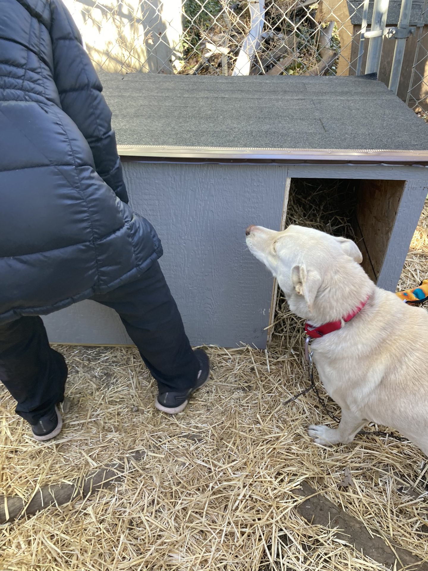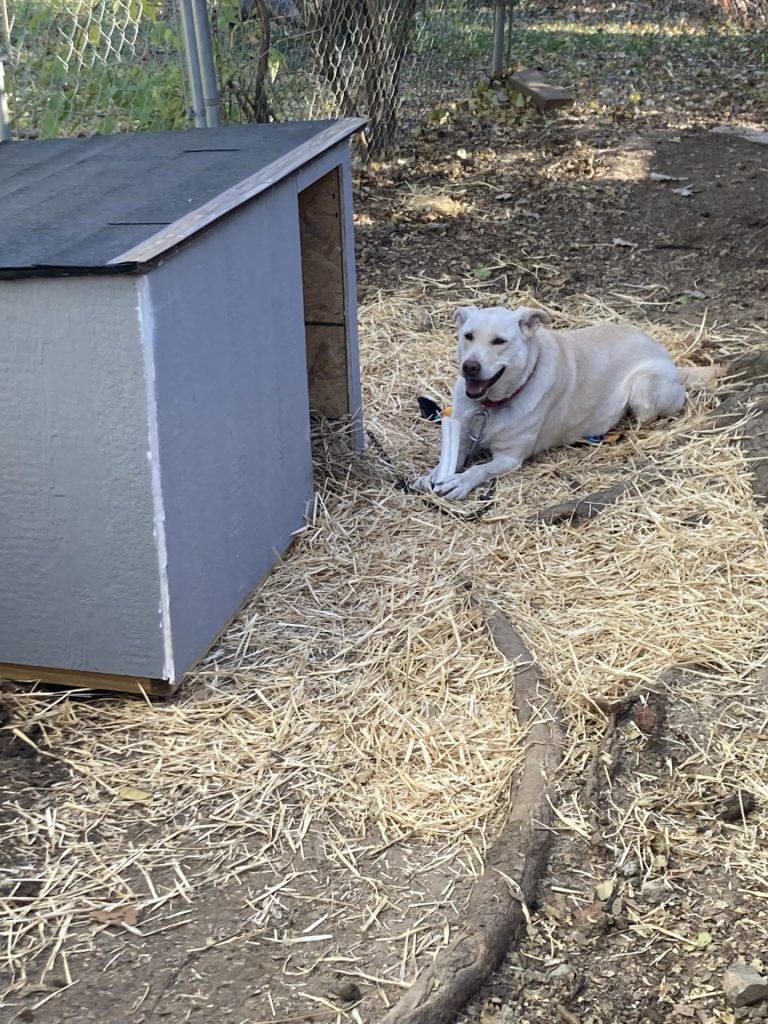 With the owner’s help, we were able to remove the old houses, set up the new insulated ones, provide toys, treats, and straw and provided Grace with a secure new collar. In addition, the owner had already set up heated water bowls for both dogs by the time we had arrived that morning.